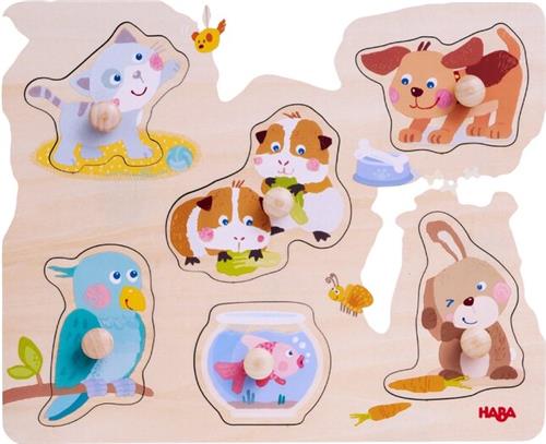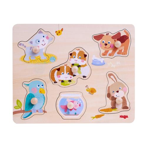 Met de HABA 306541 Vormpuzzel kunnen kinderen al spelend kennis maken met verschillende huisdieren zoals honden, katten, konijnen en cavia's. Deze kleurrijke puzzel bestaat uit 6 grote houten stukken met gemakkelijk te grijpen knoppen, waardoor het ideaal is voor de allerkleinsten vanaf 12 maanden. Het puzzelen met deze stukken bevordert de fijne motoriek en zorgt voor eerste puzzelplezier.