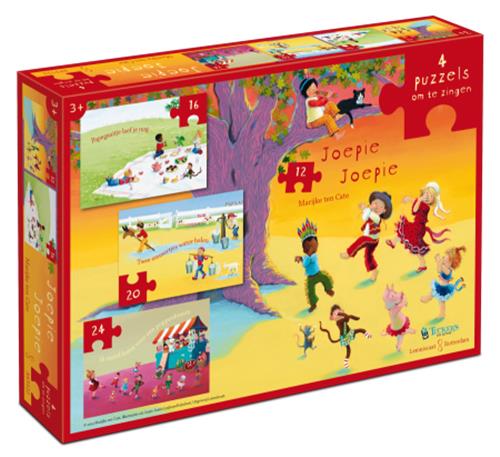 Met 4 bekende kring-, klap- en spelletjesliedjes gegoten in puzzelvorm, biedt de 'Joepie Joepie' puzzel een meeslepende en kleurrijke ervaring die het werk van Marijke ten Cate perfect weerspiegelt. Elke puzzel bevat een ander aantal stukjes, variërend van 12 tot 24, waardoor het zowel geschikt is voor beginners als voor meer ervaren puzzelaars.