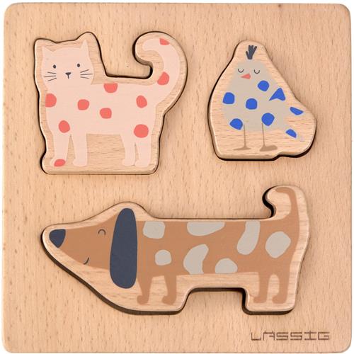 Ontdek de LÄSSIG houten insteekpuzzel, speciaal ontworpen voor peuters vanaf 12 maanden. Deze puzzel, gemaakt van 100% FSC-gecertificeerd beukenhout, is ideaal voor de eerste puzzelpogingen van jouw kleintje. Met schattige dierenmotieven zoals een hond, kat en vogeltje, stimuleert deze puzzel niet alleen de fijne motoriek maar ook de concentratie op een speelse manier.