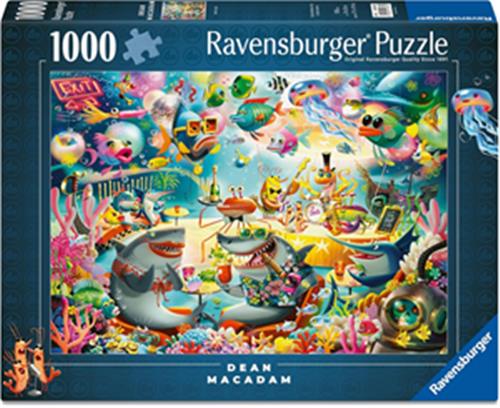 De fantasierijke afbeelding, ontworpen door Dean MacAdam, toont een vrolijk tafereel met diverse maritieme elementen, waaronder een sigaar rokende haai en een nieuwsgierige blauwe krab. Deze unieke elementen zorgen voor een leuke uitdaging en bieden een verhaallijn die je kan inspireren terwijl je de puzzel voltooit.