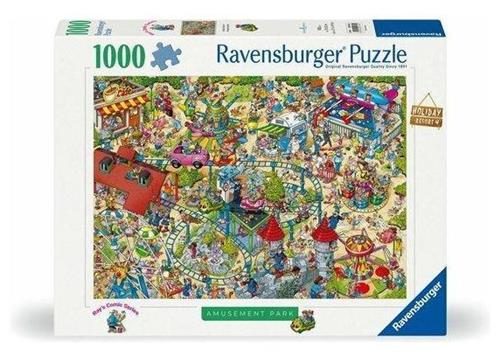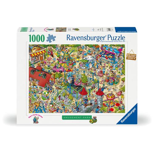 Stap in de vrolijke wereld van Ray's Comic Series met de Ravensburger puzzel Holiday Resort 4: The Amusement Park! Deze legpuzzel van 1000 stukjes, geïllustreerd door Ray Nicholson, neemt je mee naar een dag vol plezier in het pretpark van het vakantiepark. Grappige figuurtjes, dieren en onverwachte gebeurtenissen zorgen voor een avontuurlijke puzzelervaring.